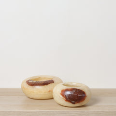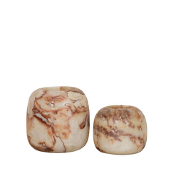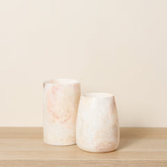 Alabaster is een natuurlijk gesteente, en daardoor is elke houder echt uniek. Wat je op de foto ziet, is één kant van de houder. De andere kant blijft nog een verrassing, met zijn eigen kleuren en patronen. Precies dát maakt jouw set zo bijzonder.