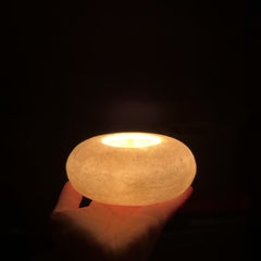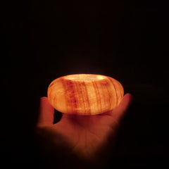 Alabaster is een natuurlijk gesteente en daar gebeurt iets bijzonders mee zodra je een kaarsje aansteekt. Het licht gloeit erdoorheen op een manier die je met geen enkel ander materiaal krijgt: zacht, warm en een beetje dromerig. En omdat alles handgemaakt is, is elke houder anders. Je haalt hiermee dus echt een uniek product in huis.